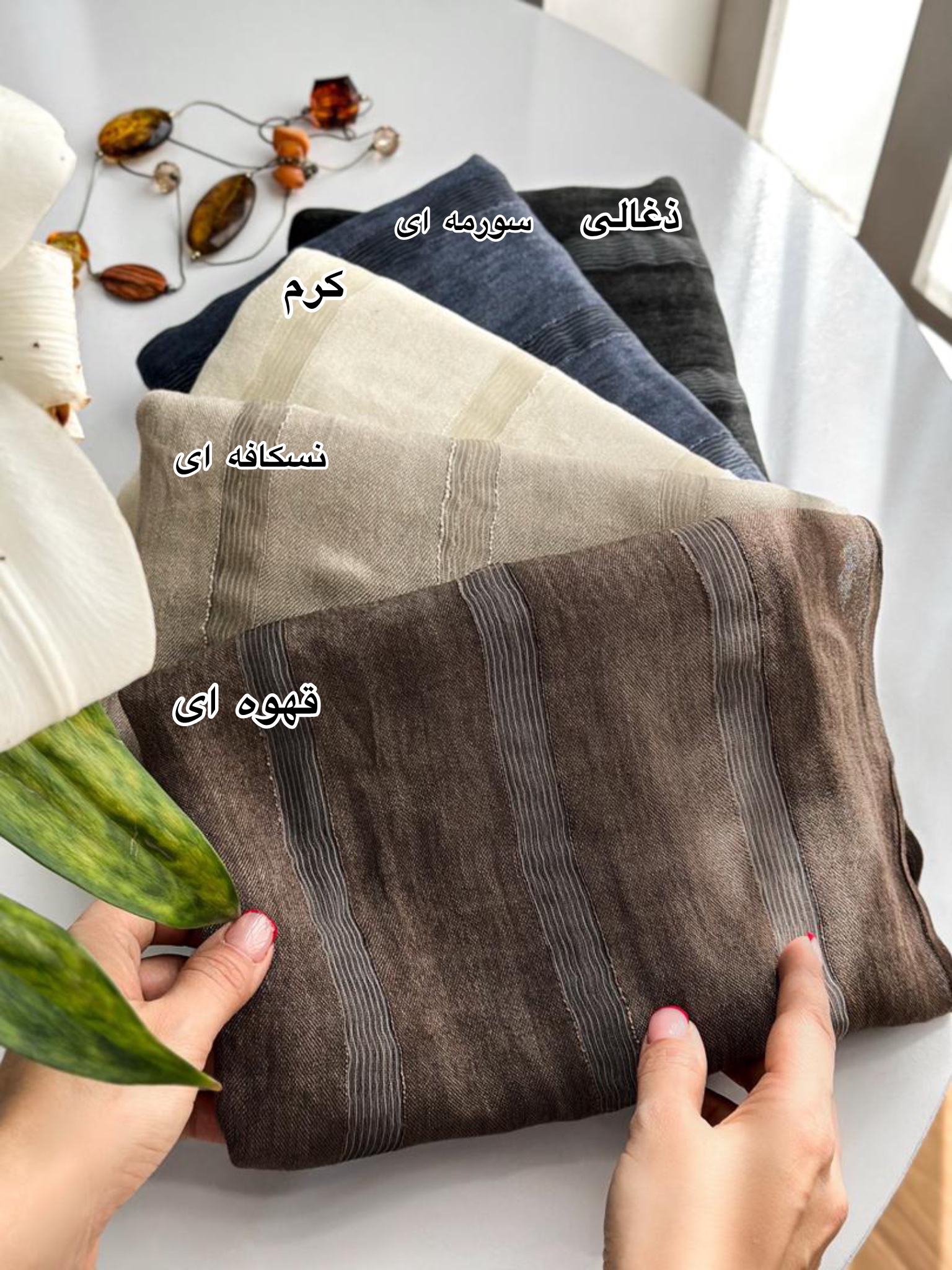 | رنگ شال روسری | ذغالی, سورمه ای, قهوه ای, کرم, نسکافه ای |