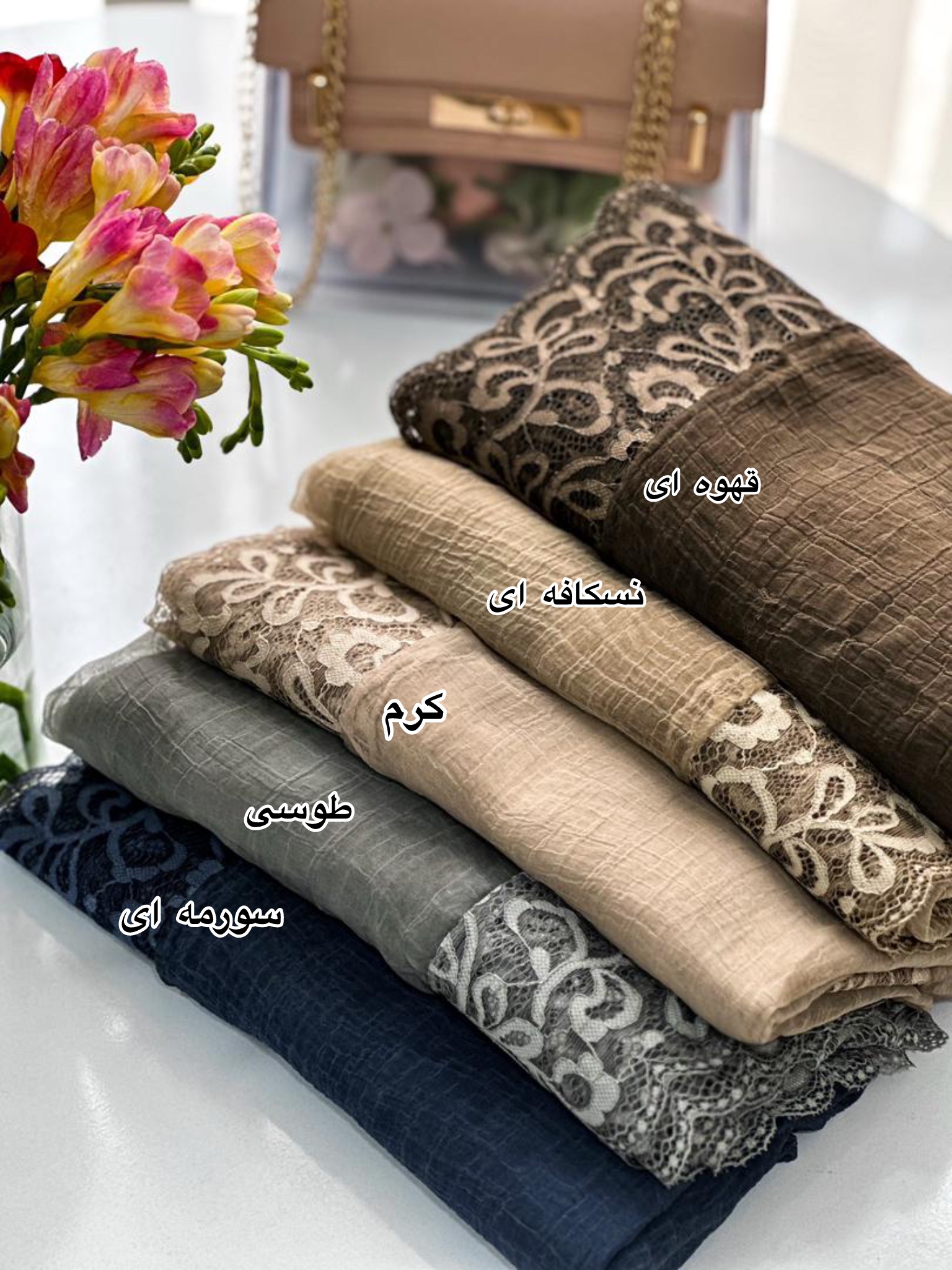 | رنگ شال روسری | سورمه ای, طوسی, قهوه ای, کرم, نسکافه ای |
